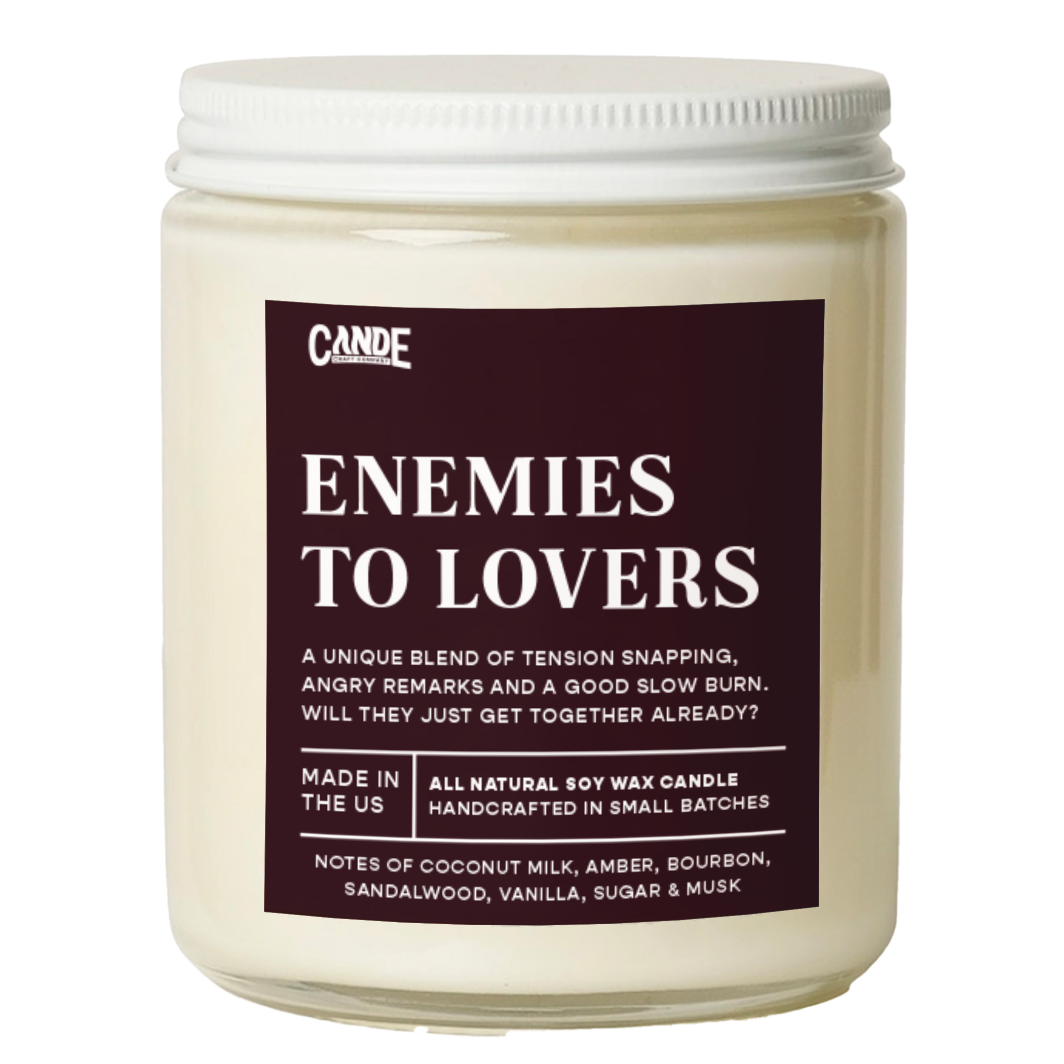 Inspired by the beloved Enemies to Lovers trope, this candle is a sultry blend of sweet coconut milk, warm amber bourbon, and creamy sandalwood. Hints of vanilla, sugar, and musk linger like the chemistry you swear you’re not catching feelings for.